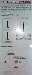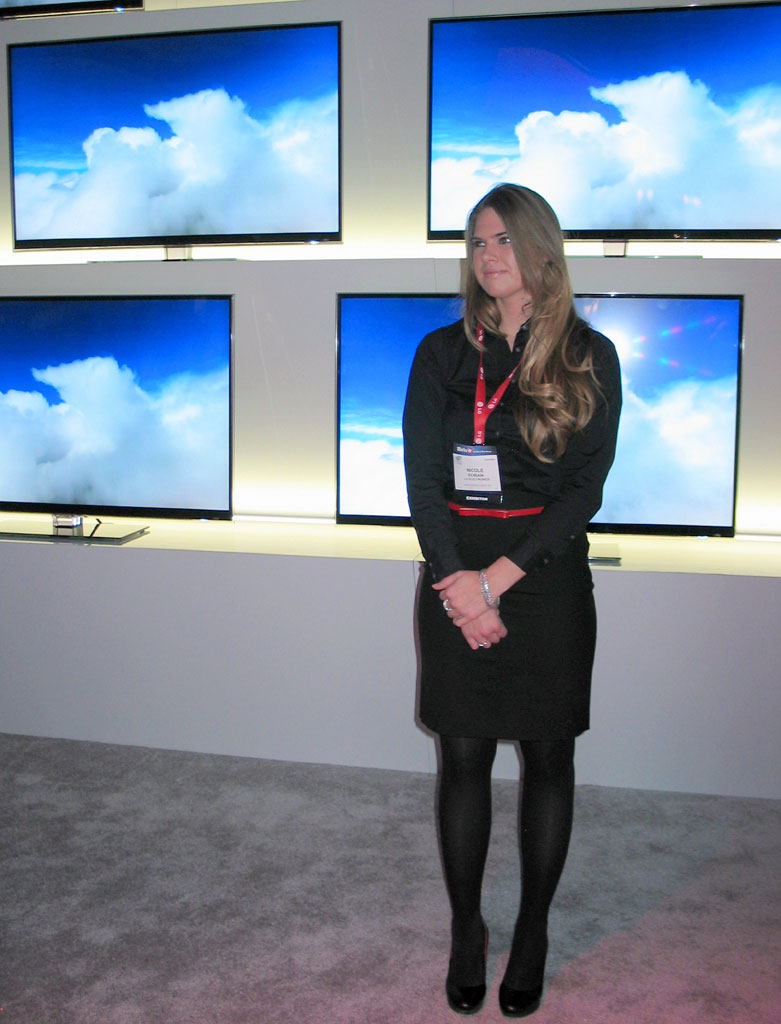 Вообще говоря, если отвлечься от главного события в телевизионной экспозиции CES-2010 — 3D-телевидения, то в остальном девиз всех основных производителей был: тоньше, контрастнее, быстрее (увеличение частоты кадров), экономичнее (в смысле потребления энергии). Компания LG фактически показала основные направления развития телевизионной техники любых производителей. Остальное — детали. Практически у каждого производителя был стенд с моделью 2009 года и рядом аналогичная модель 2010 года, на которых показывалась типовая картинка для подчёркивания улучшенного показателя. Контрастнее — значит салют на фоне чёрного неба, частота кадров — медленно двигающееся изображение, экономичнее — значит показывался ряд различных картинок: тёмная, светлая, средней освещённости и под телевизором показатели ваттметров. Фотографировать особо нечего, но, тем не менее, постоянно ловишь себя на мысли: «Эх, что-то рано я себе телевизор купил» :-). Причём неважно, ЖК это или плазма.