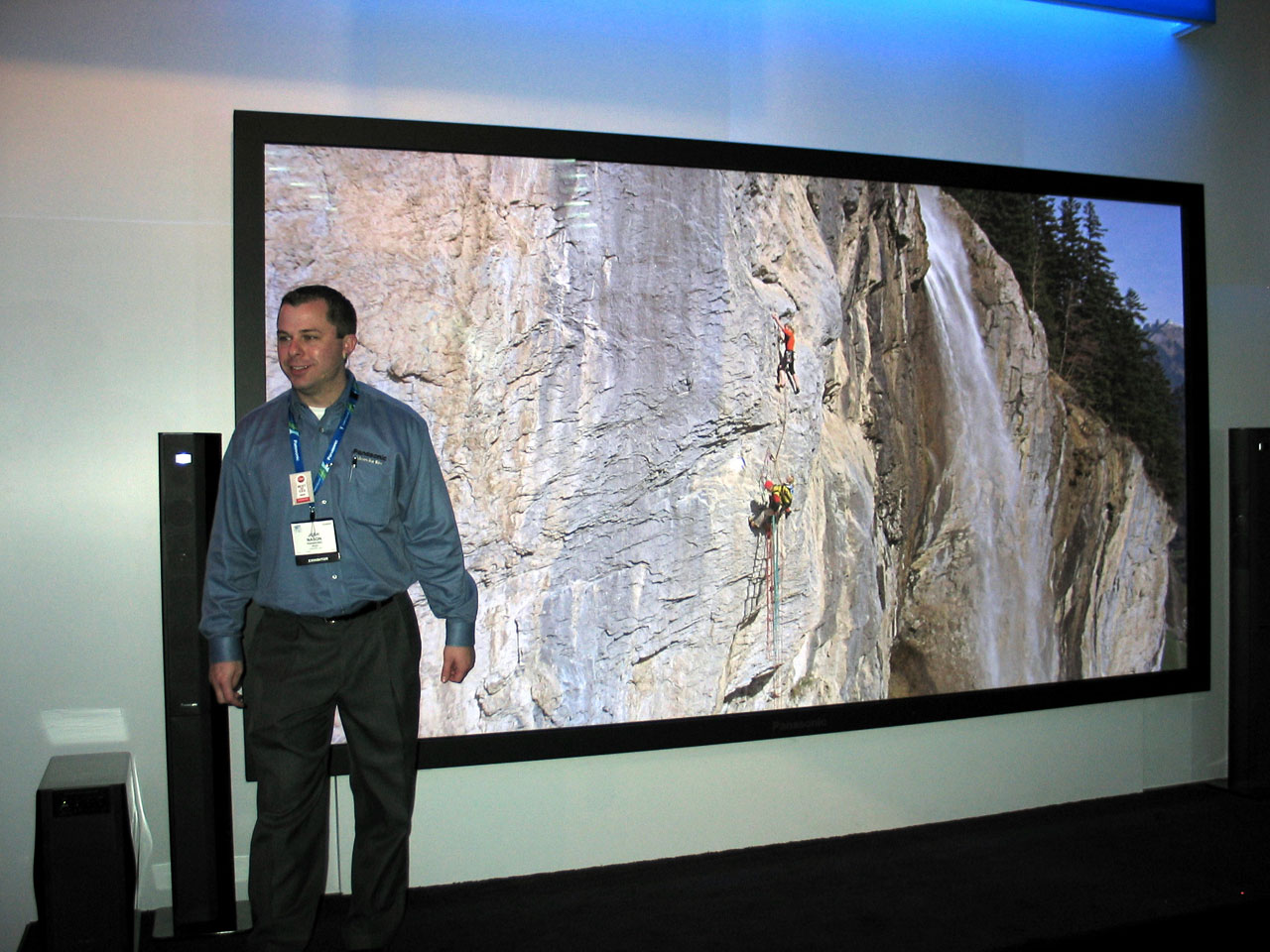 Вот так выглядит её величество плазма от Panasonic размером 152" и с разрешением 4096х2160. Что интересно, в отличие от LG здесь показывалось нормальное видео. Как сказал этот товарищ, самой большой проблемой при изготовлении этого дисплея было найти стекло для этого монстра.