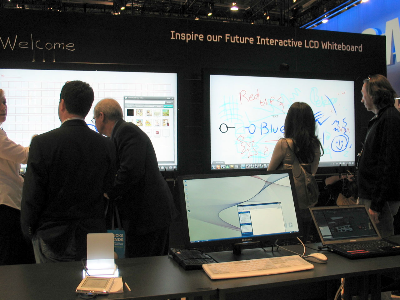 Хотя было нечто, что отличило Samsung от ряда других производителей телевизоров, и было даже удивительно увидеть эту разработку на такой выставке. Классная доска на базе ЖК-телевизора. Достаточно логичное решение, учитывая падение цен на эту аппаратуру в последние годы. Представительница компании достаточно тщательно следила за тем, чтобы никто не фотографировал эту часть экспозиции, но слава богу ещё жив стереотип, что фотограф должен быть обращён лицом к фотографируемому объекту. :-) А я не мог не показать это оригинальное решение читателям нашего сайта, тем более что некоторое время назад я работал в области «умных» досок.