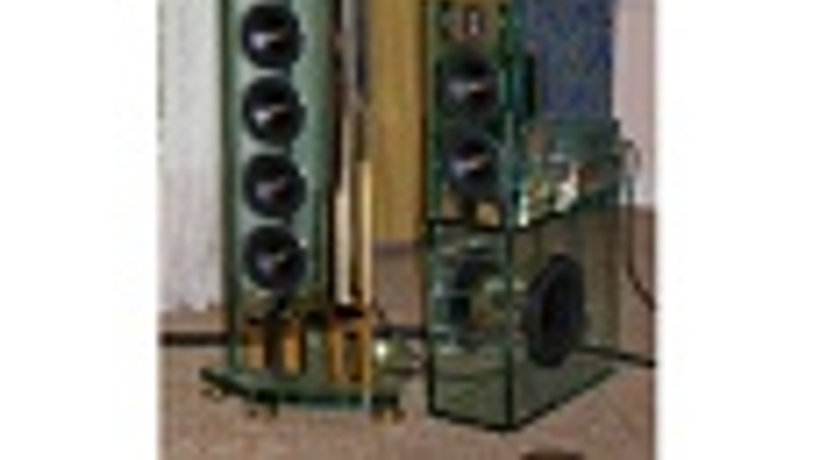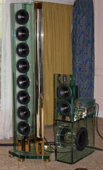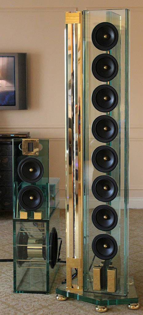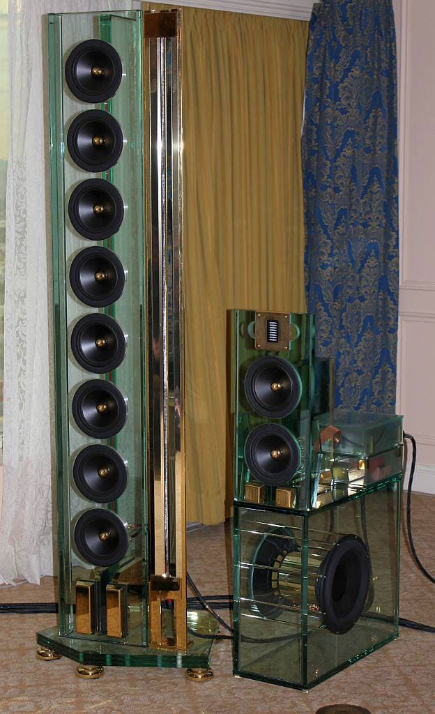 В комнате двойной площади, занимаемой этой инсталляцией, колонки должны были стоять примерно на 1/3 длины от задней стенки, вся площадь до которой используется для формирования звука. Конструкция, понятно, открытая, от фотографирования сзади попросили воздержаться. Материал изготовления колонок — закалённое стекло толщиной примерно 50 мм и золото (позолота, разумеется). Цена за пару начинается от $300 000. Дмитрию Анатольевичу, при всей его любви к хорошему звуку, есть куда стремиться. :-) О звуке вопросов не возникает, система прекрасно справляется и с классикой, и с Rammstein, но, честно говоря, подход построения таких колонок напоминает известное изречение о тысяче обезьян и романе «Война и мир». Сдаётся мне, что следующая конструкция будет состоять не из 8 динамиков, а из 10, 12 и т. д. Кто больше?