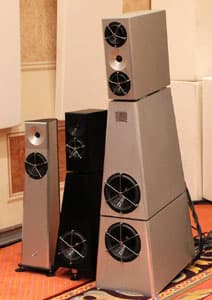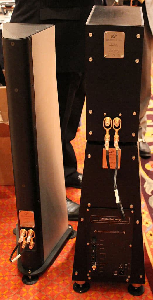 Но самое большое впечатление, по крайней мере размерами, произвела акустика компании Perfect8. 2 метра высотой, вес, в зависимости от конфигурации, от 300 до 600 кг, долговременная максимальная мощность — 600 Вт, импульсная — до 2 кВт, рекомендуемая площадь помещения — от 20 м² до 200 м².