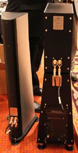 Что? Не слишком демократичные? Ну, это вы ещё не видели те, что будут чуть дальше. После них эта цена кажется такой приятной, буквально даром. Но как бы то ни было. То, что вы видите справа от колонки — это не отдельно стоящий саб. Это часть системы — такой же стоит и слева от первой колонки. Многие теперь начинают отделять низкочастотный блок от СЧ/ВЧ и снабжать его собственным усилителем. Кто-то недавно в форуме спрашивал: «Зачем ресиверу выход на два саба?» Видимо, специально для таких случаев. Лично мне это кажется чисто маркетинговым ходом. Просто сделать колонки при таком подходе легче, а продать их можно дороже. Звучание не поразило ничем особенным. Может быть, звуковой материал был не слишком агрессивным, чтобы показать возможности этих колонок. Мягкий бас, чистенькая середина и верхи.