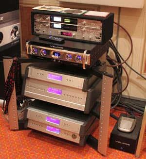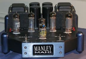 Ладно, поднялись, заходим в первую комнату. Занятно: ламповые усилители Manley Laboratories, Inc. Вы знаете о такой? Я — нет. Показывают вот такие конструкции: