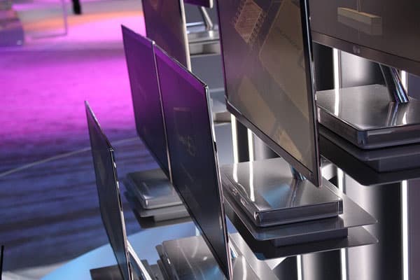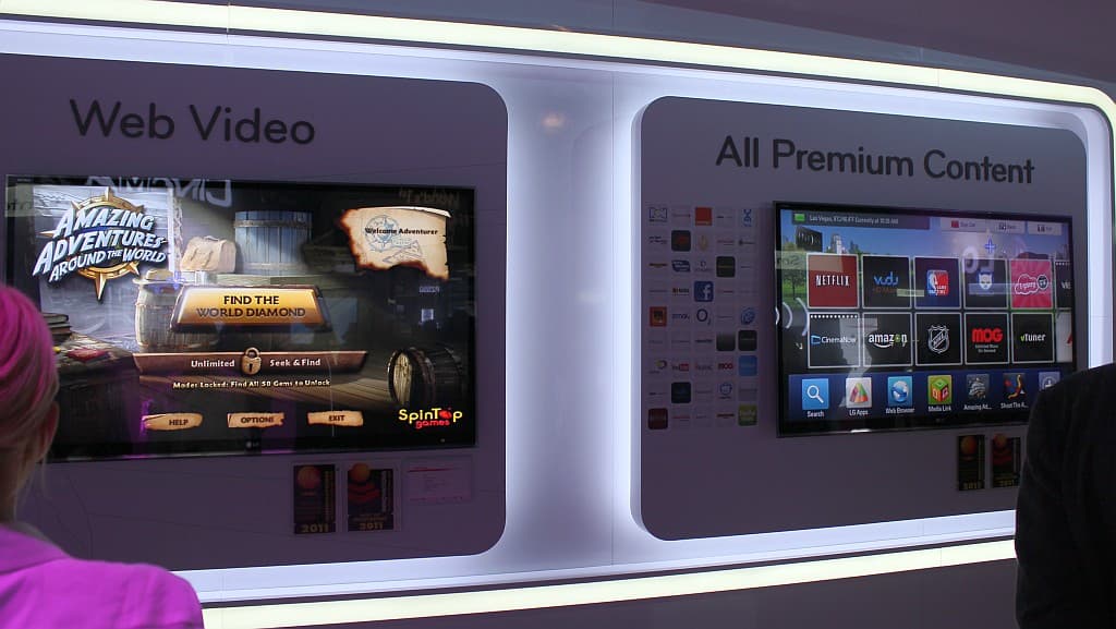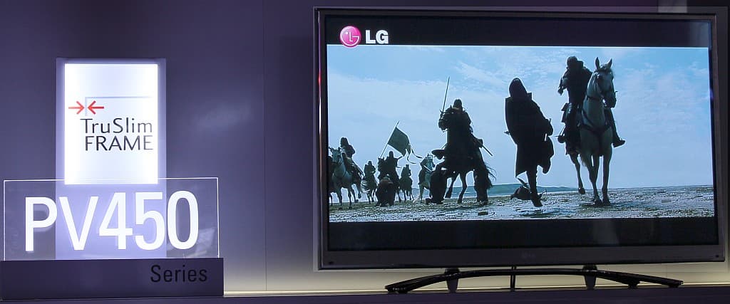 В прошлом году самая большая часть выставки была занята телевизорами всех брендов и мастей. Это был просто телевизионный бум. Телевизоры были повсюду, у каждой компании были сооружены целые телевизионные стены, показывающие новые достижения в контрасте, в потреблении, в обработке… У всех стояли очереди, чтобы увидеть это чудо — 3D-видео. В отличие от CES 2010 телевизионная составляющая этой выставки получилась весьма скудной. Пожалуй, только экспозиция LG напоминала прошлогодний праздник жизни, но и у этой компании она был существенно скромнее: пару видеорядов на входе и одна стенка внутри. Если вы помните, в предыдущий раз LG показывала инженерные образцы телевизоров с супертонкими фреймами, а уже в этом году они преобразовались в новую серию PV4xx, как показано на примере PV450 ниже.