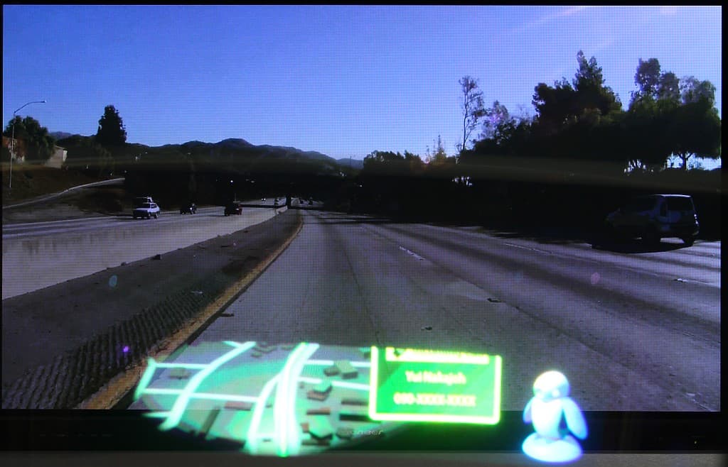 Это миниатюрный лазерный прожектор, показывающий карту с GPS на полупрозрачном зеркале, установленном перед ветровым стеклом. Симулятор представлял из себя телевизор, разместившийся метрах в двух от водительского сидения с ветровым стеклом и этой установкой перед ним.