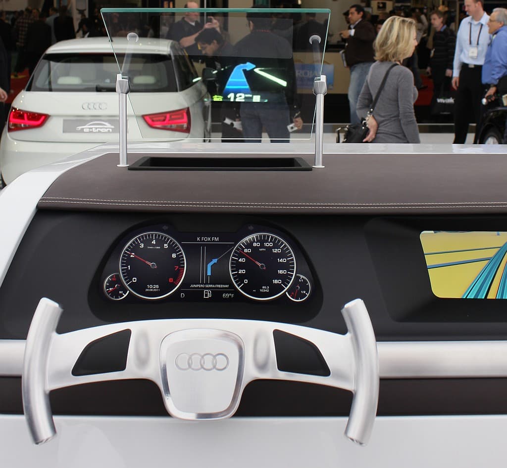 Вот какую компанию я совсем не ожидал увидеть на этой выставке — Audi. Она демонстрировала своё видение целеуказания следования по маршруту, которое тоже имеет право на жизнь. Причём прямо на лобовом стекле автомобиля.