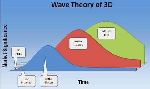 Перед выставкой в сети и в бумажных публикациях муссировалась информация о новой технологии 3D без очков. В одной из рассылок показывалась, например, такая картинка предсказания воздействия 3D-телевидения на рынок: