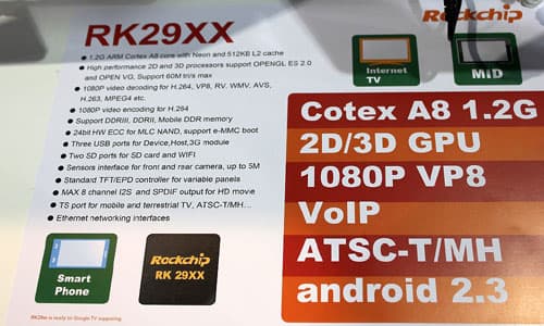 На фоне этих поделок на Атоме или ARM выделилась одна китайская компания Rockchip, в экспозиции которой было несколько планшетов, eBooks и тому подобных устройств на OS Android, но рекламировали они не их, а свой чип RK29XX, на чей базе они и были сделаны.