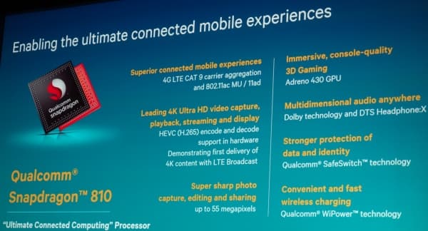 Новый мощный 64-битный чип Snapdragon 810, выполненный по техпроцессу 20 нм, разработан Qualcomm для наиболее производительных мобильных устройств топового уровня и имеет 8 процессорных ядер, четыре из которых — Cortex A57, а другие четыре — Cortex A53. В состав данной SoC входит новейший GPU Adreno 430, интегрирована поддержка 4G LTE Advanced Cat6 с теоретической максимальной скоростью до 300 Мбит/с на прием. Поддерживаются все международные стандарты, в том числе LTE FDD, LTE TDD, WCDMA (DC-HSPA+, DC-HSUPA), CDMA1x, EV-DO Rev. B, TD-SCDMA и GSM/EDGE. Также среди сетевых возможностей Snapdragon 810 значатся поддержка Bluetooth 4.1 и Wi-Fi Qualcomm VIVE 2-stream 802.11n/ac with MU-MIMO.