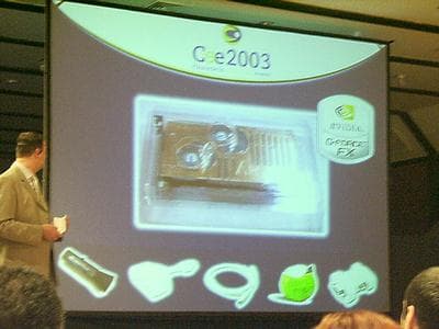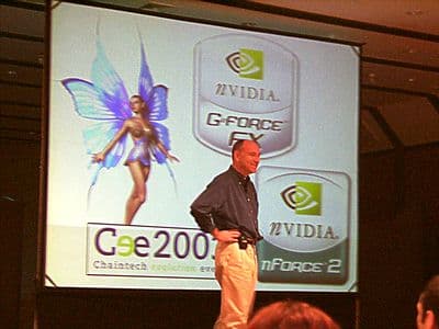 После очередного перерыва последовала презентация NVIDIA. При всем желании не смог бы утверждать, что небольшое шоу, показанное в рамках демонстрации возможностей GeForce FX, оставило зал равнодушным, но все же пересказывать его не стану, так как и информация о подобной презентации в Москве, и детальнейшее исследование нового видеоускорителя уже приведены на сайте и выполнены куда более компетентными в этом вопросе спецами нашей «Видеосистемы». То же самое относится и к представлению nForce2, так как наши читатели уже могли подробно познакомиться с этим чипсетом в статьях сайта.