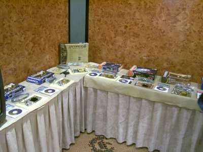 В ожидании начала можно было рассмотреть выставку продукции компании: вдоль одной стены тянулись ряды материнских плат (к которым мы еще вернемся), вдоль другой — видеокарт, начиная с первых чипов NVIDIA.