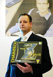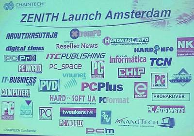 Разумеется, всем интересно узнать, как идут дела у компании Chaintech, каких она добилась успехов и как замечательно продаются ее продукты, но на этом я останавливаться не буду, об этом всем — как нибудь в следующий раз. Правда, минуя подробности пиар-вступления и сразу переходя к техническим деталям рассказа г-на ван Дийка, не удержусь от показа представленного им слайда о презентации плат серии Zenith в Голландии, на котором гордо красуется лого нашей компании: