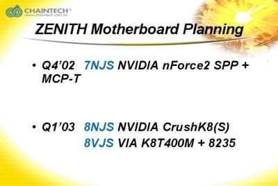 Стержнем всей презентации Chaintech был анонс вывода компанией на рынок новых high-end системных плат семейства Zenith. Поскольку в это семейство входят решения на семействе чипсетов nForce2 под процессоры семейства К7, выступление Chaintech было гармонично завязано с презентациями NVIDIA и AMD.