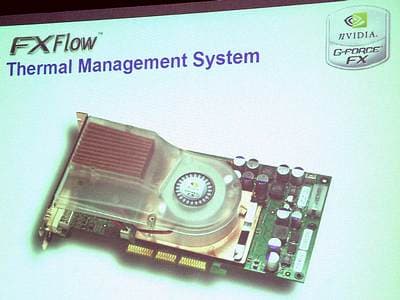 Разумеется, большая часть презентации NVIDIA была посвящена графическим решениям компании, главным образом, хиту сезона, чипу GeForceFX, карту на котором любой желающий мог потрогать своими руками (подробные фото платы — в нашей новости NVIDIA GeForceFX — в iXBT.com!, на одной из них GeForceFX — в руках Андрея Воробьева). При этом, еще одна карта стояла в ПК, разумеется, на базе платы Chaintech Zenith 7NJS и процессора Athlon XP 2800+.