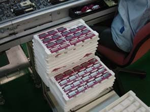 После того, как «рисунок « заготовки платы сформирован, она сушится и поступает в специальную машину, которая со скоростью швейной машинки «вшивает» транзисторы, резисторы и конденсаторы на плату. Сами микроэлементы подаются в автомат в специальных бобинах, где они находятся на одной ленте.