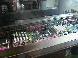Когда все крупные компоненты установлены на плате (включая слоты PCI, AGP и другие), плата проходит через специальную печку, где все ножки компонентов, которые раньше были просто вставлены в отверстия на плате, как бы испекаются и уже надежно крепятся к текстолиту платы.