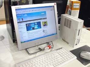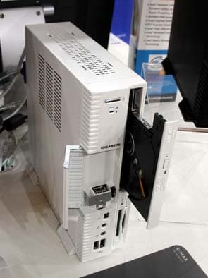 Gigabyte не может похвастать таким обилием barebone систем, как ASUS. Тем не менее, и в этой компании ведутся разработки в этом направлении. Так на стенде Gigabyte можно было найти законченное решение из семнадцатидюймового мультимедийного ЖК-монитора Gigabyte, клавиатуры, мыши и весьма компактного, но достаточно функционального barebone. Беспроводная функция в нем является опцией и модернизируется он простой установкой USB Wi-Fi донгла в специальный отсек.