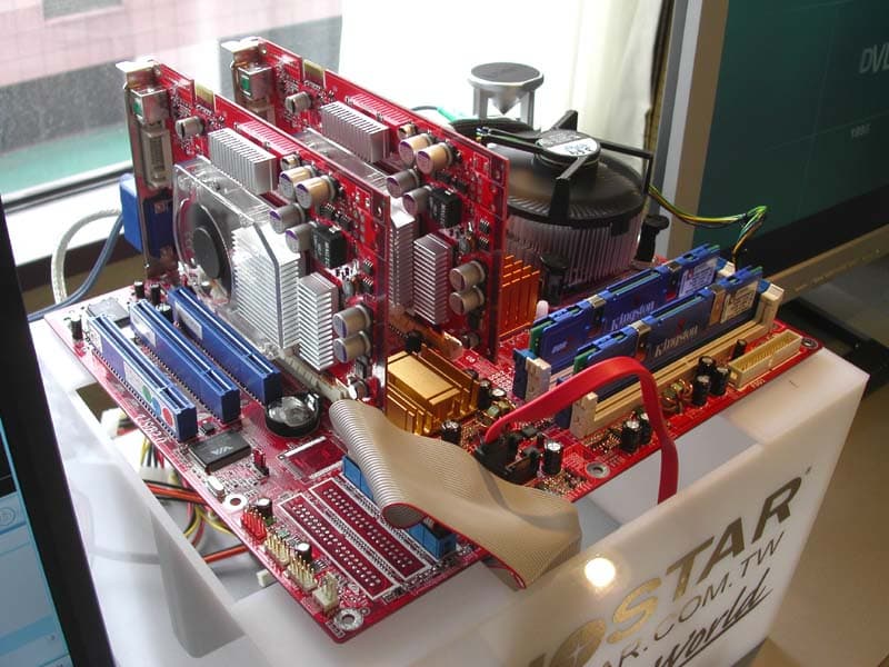 Как мы уже отмечали, вообще выставка проходла под девизом: «Каждой твари по паре». Двухъядерные процессоры, видеокарты на основе двух процессоров, много решений для SLI, анонсированная технология CrossFire, двойной интерфейс PCI-E и AGP…