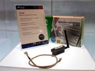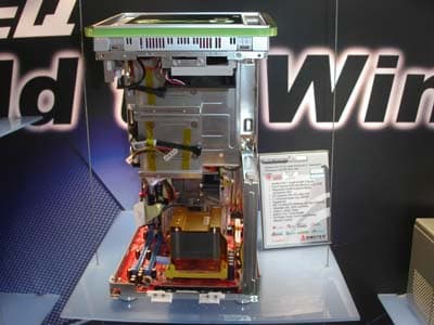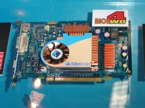 Компания представила на своём стенде полную линейку плат от 915 до 955X. Решения, в большинстве своём стандартные, а вот среди видеокарт у Albatron есть интересные разработки. Первое из них — ATOP, переходник с PCI-E на AGP, подходящий для низкопрофильных видеокарт. С виду громозкое решение вполне работоспособно в составе системы. Видеокарта выполнена на чипе GeForce 6200 со стандартными частотами — 350 Мгц — частота чипа, 128 Мбайт, 64 бит DDR.