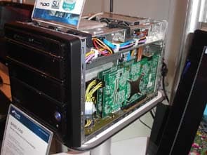 PC SN26P — это SLI решение в малом форм-факторе. Чипсет nForce 4 SLI, Socket 939, аудио на базе VIA Envy 24PT 7.1, гигабитный сетевой контроллер, 2 видеокарты GeForce 6800GT THD, производства Leadtek, по 256 МБ DDR3 на карту, система охлаждения на основе тепловых трубок, при этом система оснащена дополнительным питанием. Видеокарты стоят плотно друг к другу, но работа гарантирована, за счёт особого теплорегулирования и охлаждения внутри непросторного корпуса. Видеоподсистема поставляется отдельно как опция или вместе с barebone-системой в виде кита.