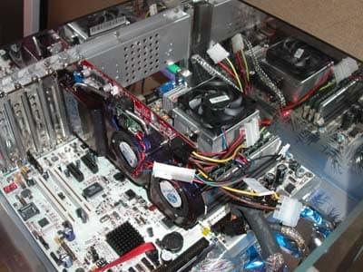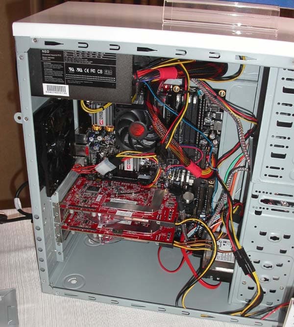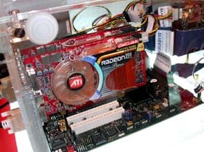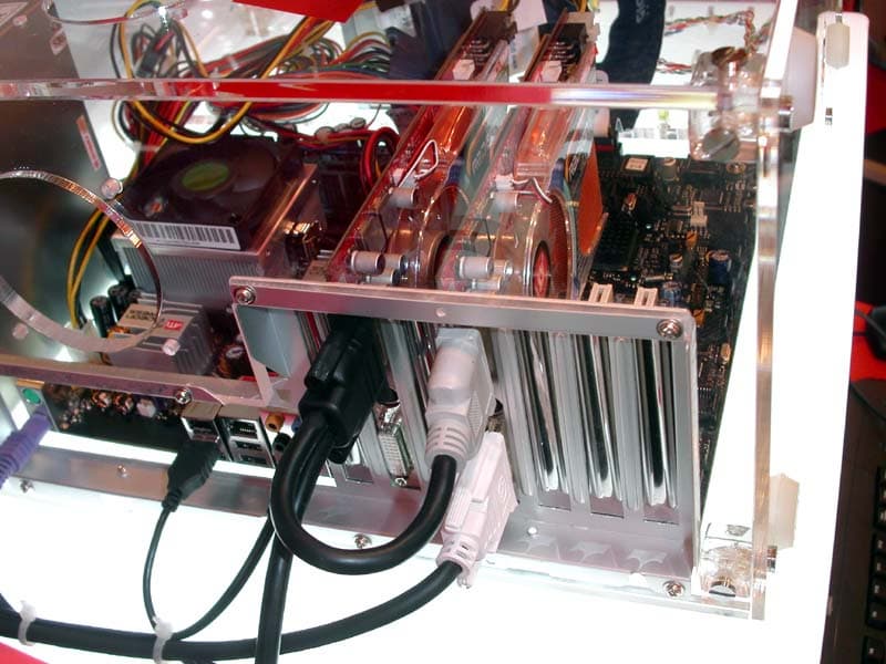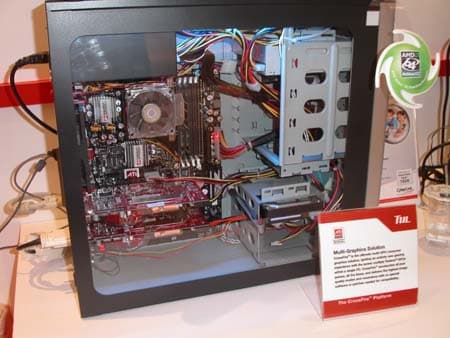 Все партнёры ATI на своих стендах представили работающие системы в подтверждение готовности поддержать новую технологию. GeCube демонстрировал работу своих видеокарт на материнской плате от Gigabyte.
