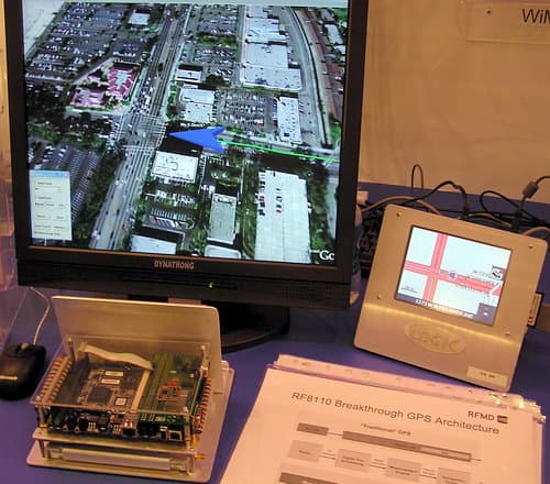 Любопытная программно-реализованная система GPS демонстрировалась на одном из стендов экспозиции Intel. В ее основу положен миниатюрный радиочип RF8110, разработанный компанией RF Micro Devices и производимый по 0,18-микронной кремниевой технологии,