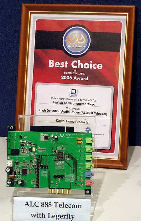 На стенде компании Realtek в отдельном стеклянном «кабинетике» гордо красовался, привлекая внимание поселителей, один из 21 лауреатов приза «Best Choice Award» этой Computex — High-Definition аудиокодек ALC888 Telecom, награжденный как лучший продукт в категории устройств для цифрового дома (Digital Home).