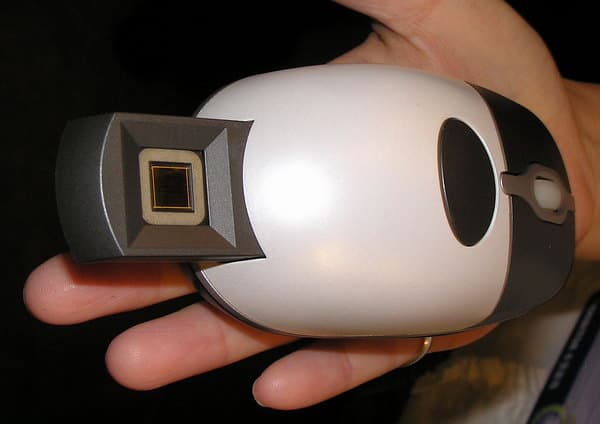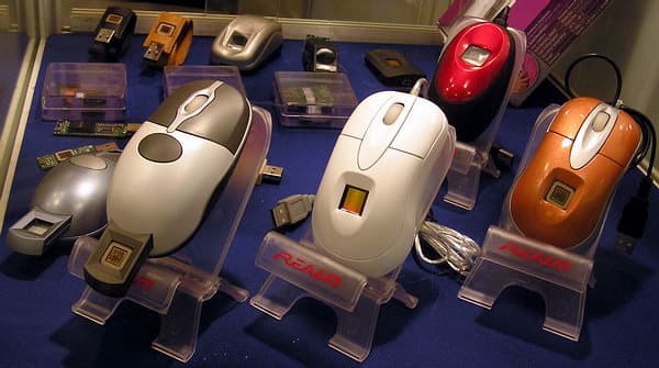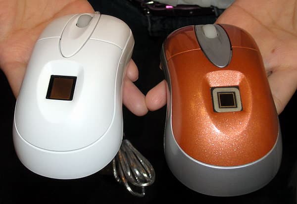 Компания Realm приютила у себя на стенде целый выводок мышей со встроенным идентификатором по отпечатку пальца (слева на фото — выдвижной датчик!).