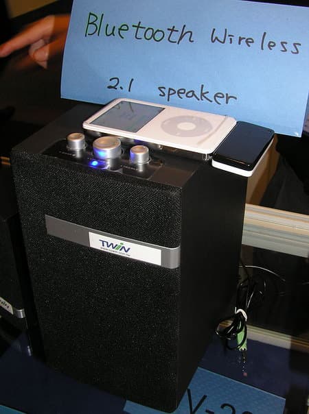 Неподалеку расположилась компьютерная акустика, принимающая звук по Bluetooth от MP3-плеера, также дооснащенного Bluetooth-модулем,