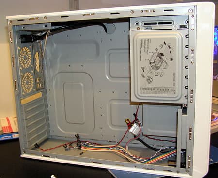 где стандартный блок питания устанавливается не сзади вверху, а спереди внизу корпуса (боком)! (Обычно корпус с такими габаритами предназначен только для микро-ATX плат и специального компактного блока питания.)