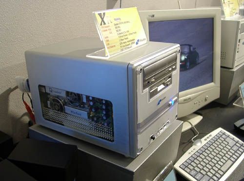 Сейчас на стенде уже представлен концепт barebone системы с процессором Р4, она отличается небольшими размерами, меняться в дальнейшем будет лишь дизайн. Особенность конкретно этой системы в том, что в ней применяются достаточно дорогие комплектующие от ноутбуков (память, жесткий диск).