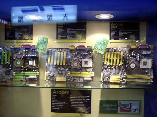 Перейдем к горячо любимой мной компании Chaintech, здесь вовсю показывали новые материнские платы линейки Apogee, встречаются достаточно любопытные решения.
