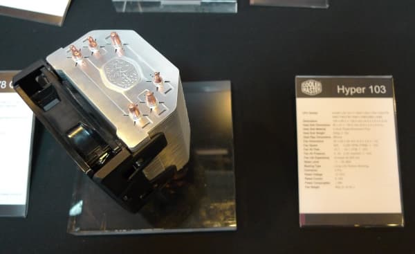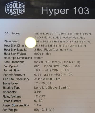 А вот новый процессорный охладитель Cooler Master Hyper 103 весит всего 580 граммов и является куда более компактной и бюджетной моделью. Кулер башенного типа состоит из трех U-образных медных тепловых трубок диаметром 6 мм и одного бокового вентилятора 92 мм. Вентилятор вращается со скоростью 800—2200 об/мин, при этом его производительность достигает 73,2 м³/ч, а уровень шума — 30 дБА. Размеры новинки равняются 108×89,5×138,5 мм. Поддерживаются все современные процессорные сокеты, включая LGA2011, LGA115x, LGA1366, AM3+, AM3, FM2 и FM1.