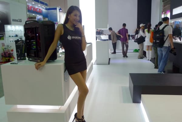 Ну и не пройти было, конечно, мимо игровой периферии, которой в компании традиционно уделяется очень много внимания. Еще бы — ведь именно люди, играющие в виртуальные игры, как никто другой всегда поддержат самые безумные и дорогостоящие выдумки производителей в плане бесконечного наращивания компьютерных мощностей. Cooler Master привлекла даже для своих промоутерских целей одну из самых популярных в Азии представительниц игровой молодежи — тайваньскую ведущую онлайн-трансляций на игровые темы, девушку по имени Li Chen. Брутальные плакаты с ее изображением виднелись в этот раз буквально на каждом углу выставочного стенда компании.
