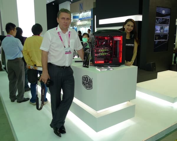 Таким образом, нам было что пофотографировать, и нашлось о чем рассказать читателям в данном репортаже. Начнем, пожалуй, с «любимчиков» самой Cooler Master. Это, конечно же, корпуса для настольных компьютеров. Им в компании традиционно в последние годы отводятся самые видные передовые места на выставочных стендах. Недаром основной «жемчужиной» прошлогодней коллекции предстал перед посетителями выставочного стенда Cooler Master корпус под названием Cosmos II. Этот роскошный по всем параметрам «Ultra Tower» не только занимал центральную позицию на стенде компании, но и явился истинным рекордсменом, получив массу разнообразных наград, и одной из них, как раз была медаль, полученная из рук самих устроителей выставки Computex. В этом году потомок легендарного Cosmos также присутствовал на стенде, и так же, как в прошлом году его предок, занимал самое видное место в экспозиции — центральную точку, около которой происходили все фотосессии с участием специально приглашенных азиатских красавиц-моделей. Кстати говоря, самая красивая модель на выставке, по нашему скромному мнению, работала именно на стенде Cooler Master. Здесь же, около обновленного Cosmos встретил нас и сам гостеприимный хозяин стенда — неизменный руководитель российского офиса компании Cooler Master, Владислав Филатов.