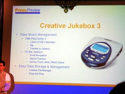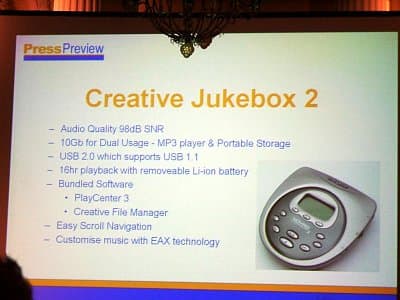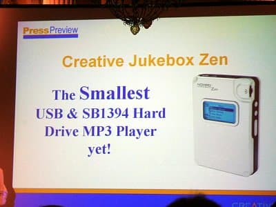 Jukebox Zen. Позиционируется, как самый маленький плеер с применением жесткого диска и поддержкой интерфейсов USB (1.1) и FireWire, однако при этом обладает достаточно 20-гигабайнтным диском, буфером на 7 минут (16 МБ RAM). Заявленное время работы от батарей — 12 часов.