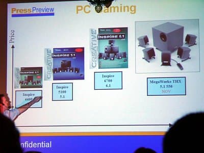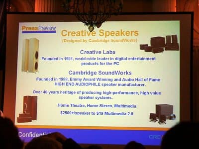 Начало выступления было посвящено общим вопросам, и в нем рассказывалось об истории фирм Creative и Cambridge Soundworks на рынке акустических систем, а также своим достижениям. В настоящее время компания Сreative прочно удерживает ведущее место в качестве поставщика акустических систем на большинстве европейских рынков. Однако не будем задерживаться на чисто маркетинговой информации и перейдем собственно к линейкам представленных продуктов.