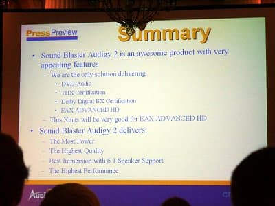 Во вторник, 8 октября 2002 года, в Варшаве прошла очередная пресс-конференция компании Сreative. Основным поводом события стал выпуск на рынок новейшей звуковой карты, Audigy 2, однако менеджеры компании воспользовались оказией, чтобы обрисовать различные потребительские линейки продуктов компании Creative, присутствующие на рынке, и дать более четкое представление о них. Поэтому достаточно большая часть презентации не содержит более новой информации по сравнению с новостями и пресс-релизами компании, уже знакомыми большинству читателей. С другой стороны, рассказ о ней поможет систематизировать и упорядочить эту информацию, давая более широкий охват представленных на рынке продуктов и технологий.