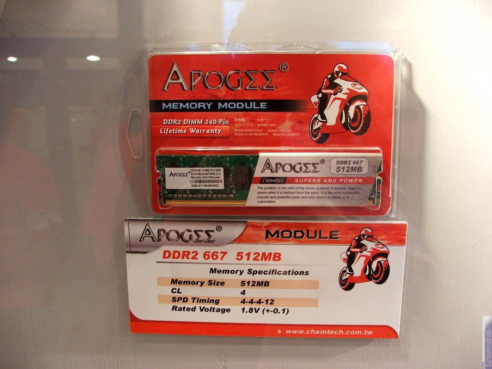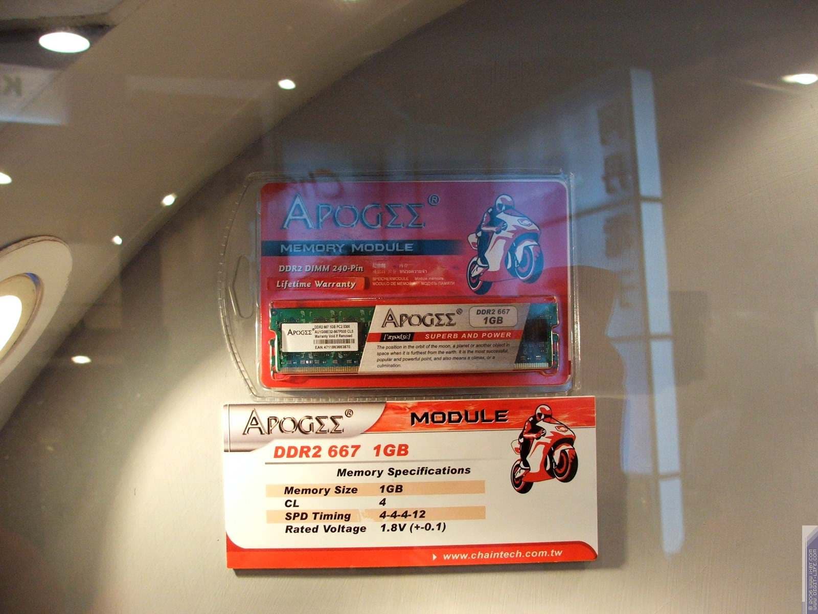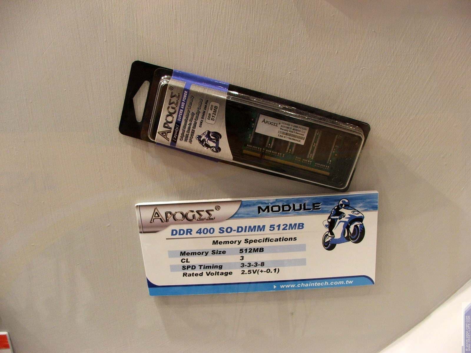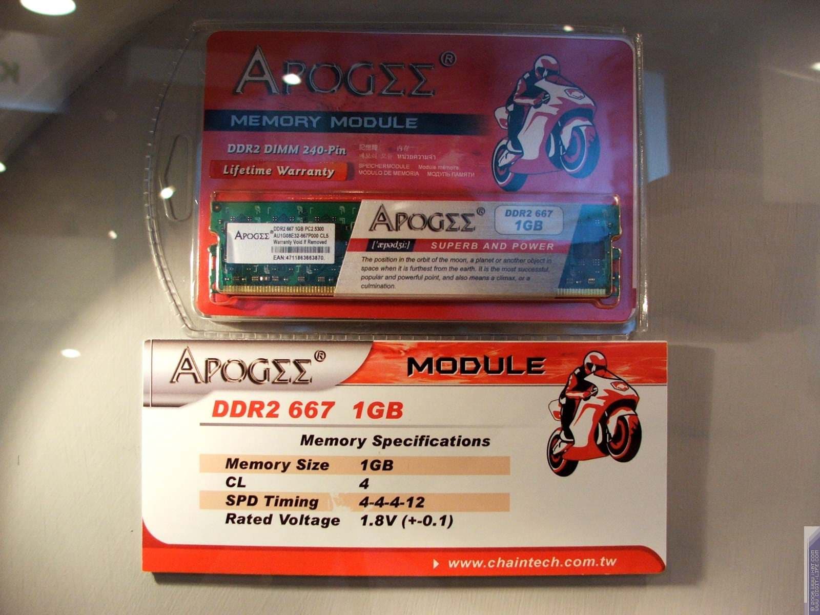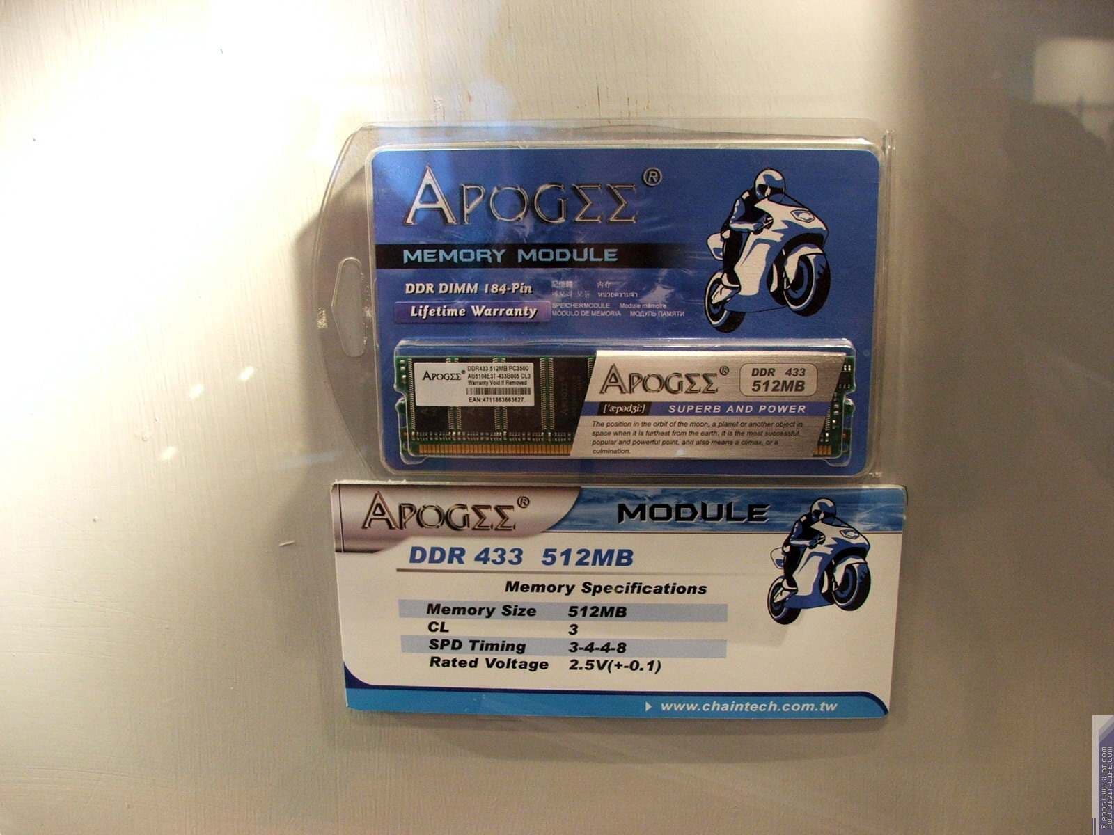 Ну и конечно, новинки от Chaintech — всевозможные модули и микросхемы памяти. Для этого вида продукции была выбрана известная марка APOGEE.