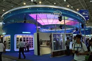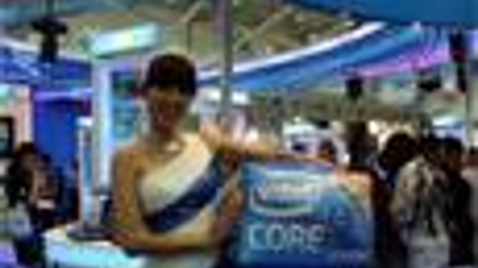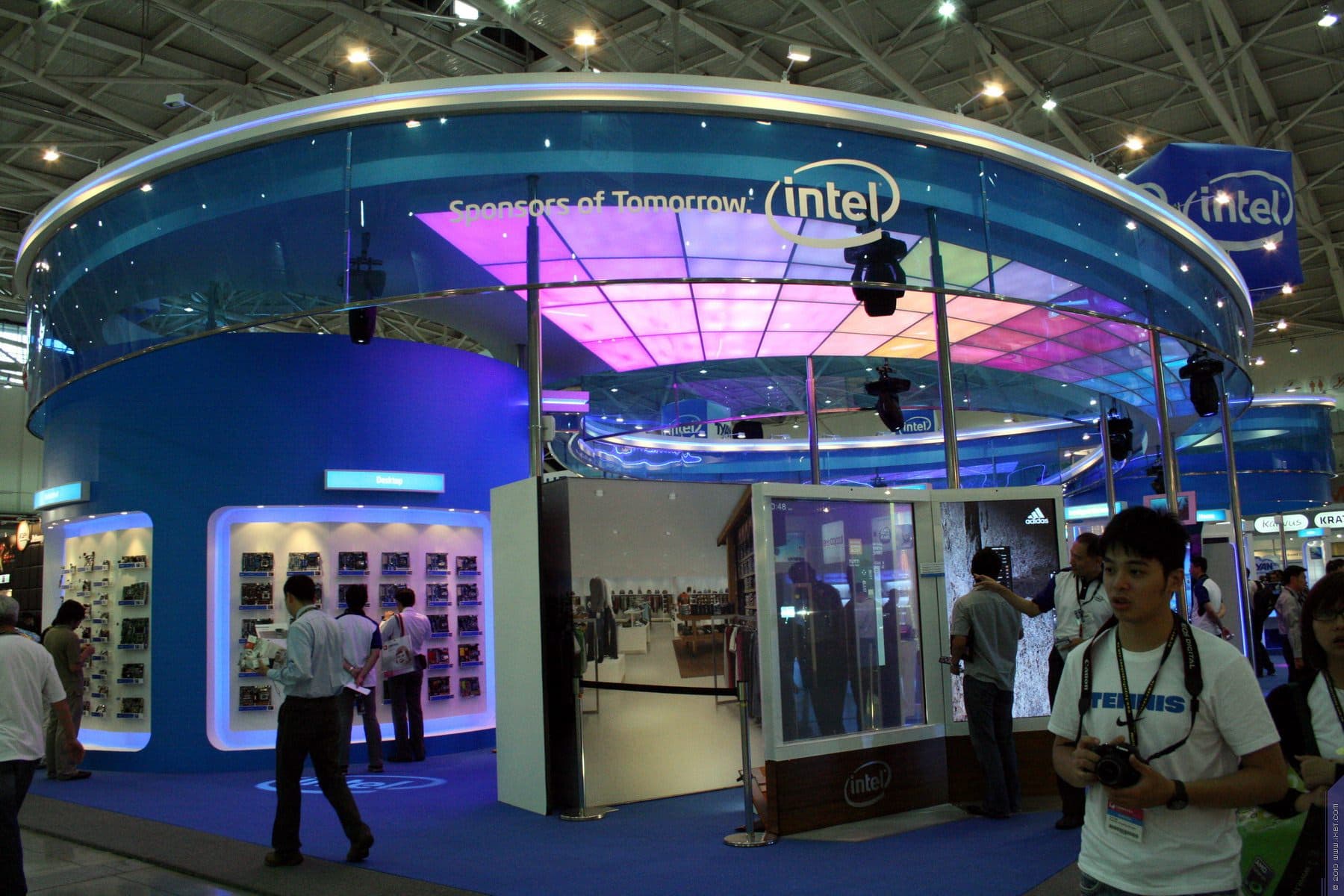 Просто несколько кадров из зала. Компания Intel имела просто колоссальных размеров стенд округлой формы, при этом, как обычно, на стенде раздавали всякие подарки и сувениры. В том числе и надувные кубики. Неподалеку от зала, в специальной комнате (как можно было заметить через открытую дверь) сидели бедные китайцы и надували сотнями эти кубики (разумеется не ртом, а с помощью спецнасосов :-))). И ради чего? Чтобы получившие такие кубики тут же ходили по залу, тужась и не менее тщательно сдувая их.