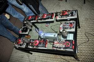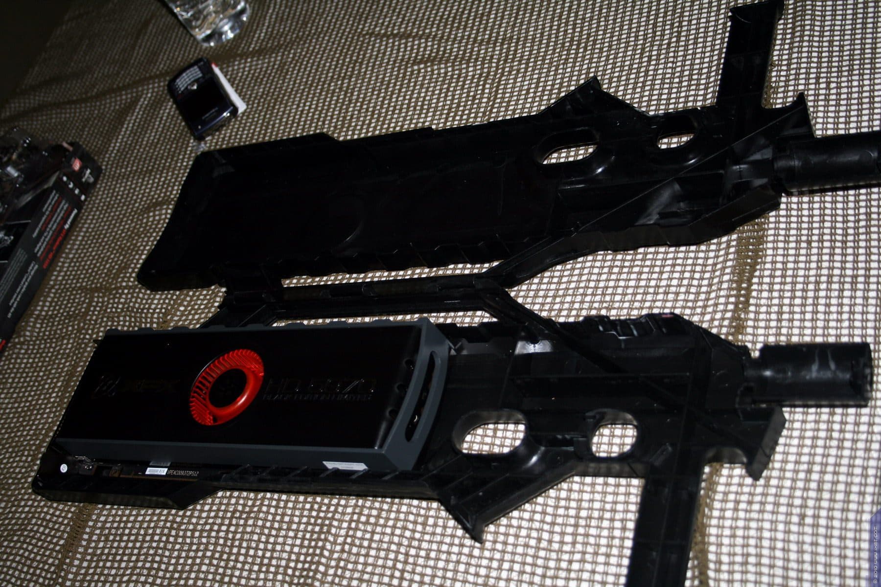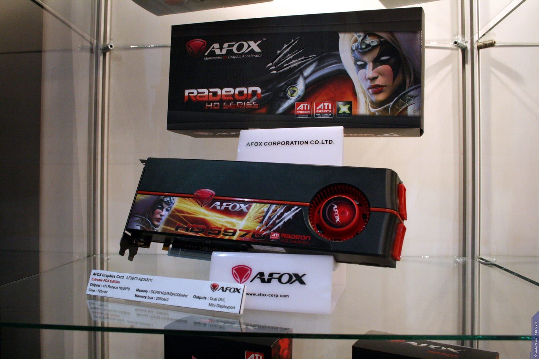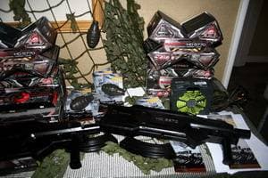 Компания демонстрировала свою новинку — Radeon HD 5970 с четырьмя гигабайтами памяти (два гигабайта на каждый процессор). В качестве коробки — пластиковый муляж настоящего автомата. Да, это фирменный стиль XFX — все милитари, военное, цвета хаки. Видеокарта эта выпущена очень ограниченным тиражом в 1000 штук, и потому цена будет крайне высокой, 1000 долларов США.