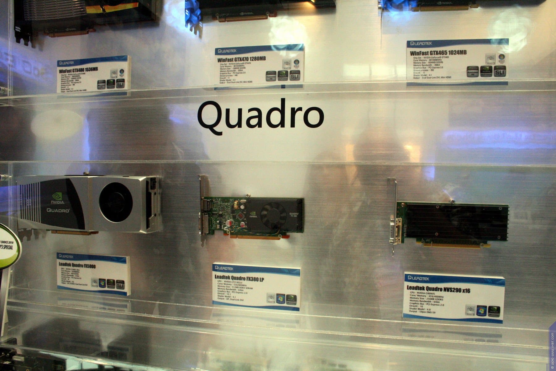 В том же зале находился и стенд Leadtek. К моему огромному сожалению, некогда известная своими уникальными решениями в области видеокарт компания как-то сильно охладела к данному виду бизнеса, и почти все видеокарты под маркой Leadtek на деле являются копиями референс. Крайне тяжело найти какую-то интересную разработку по видеокартам от инженеров этой компании. А ведь еще лет пять-семь назад имя Leadtek гремело и пользовалось огромным авторитетом не только из-за интересных решений в области охлаждения, но и из-за безупречного качества продукции. Ныне же мы видим видеокарты, произведенные даже не самой компанией Leadtek, а купленные у NVIDIA референс-образцы, снабженные соответствующими стикерами.