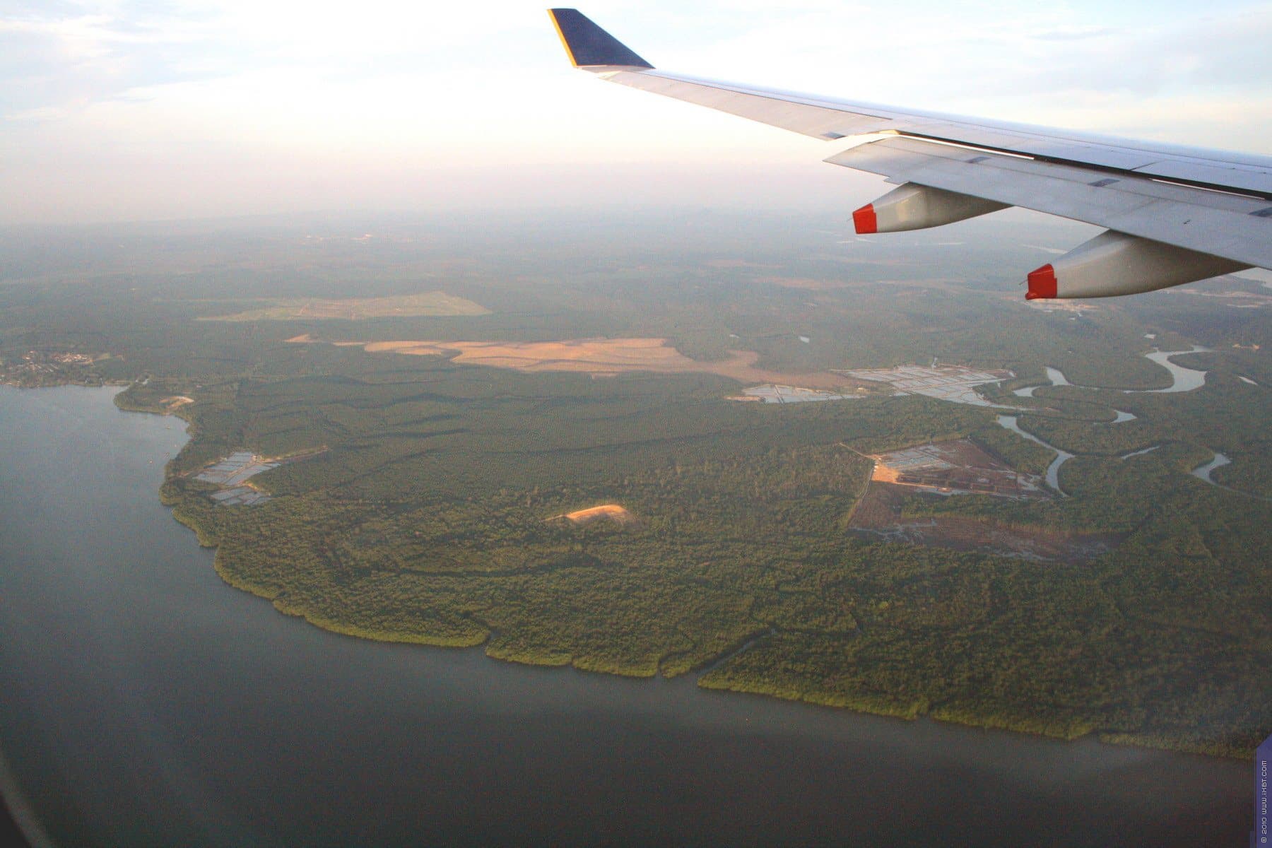 Мы долго летели над массивами океана, куда то и дело изливали свое горе облака, вспыхивая радугами после облегчения, как вдруг появилась земля. По характерным полукруглым формам поселков можно сразу же понять, что это Малайзия. Страна обилия таунхаусов, которые там являются вполне доступным жильем, в отличие от России.