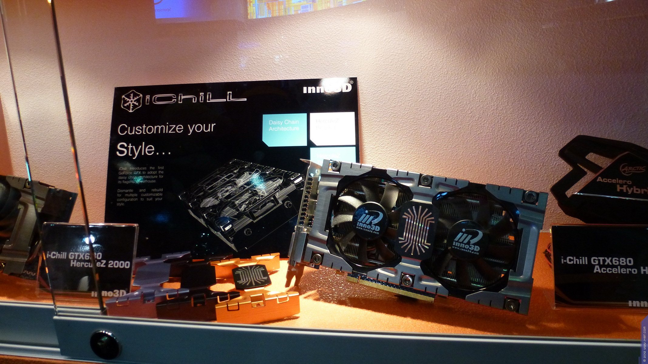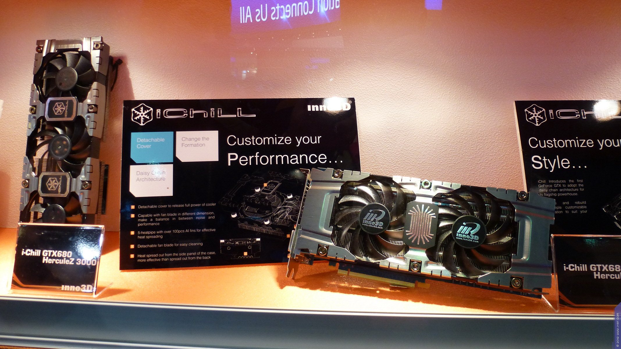 Inno3D демонстрировал также некоторые новации в области систем охлаждения, например трехвентиляторный кулер с возможностью простого демонтажа третьего вентилятора (при отсутствии надобности в нем). Также они переходят на новые версии СО серии iChill, предусматривающие возможность откидывания вентиляторов для чистки их и радиаторов от пыли.