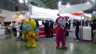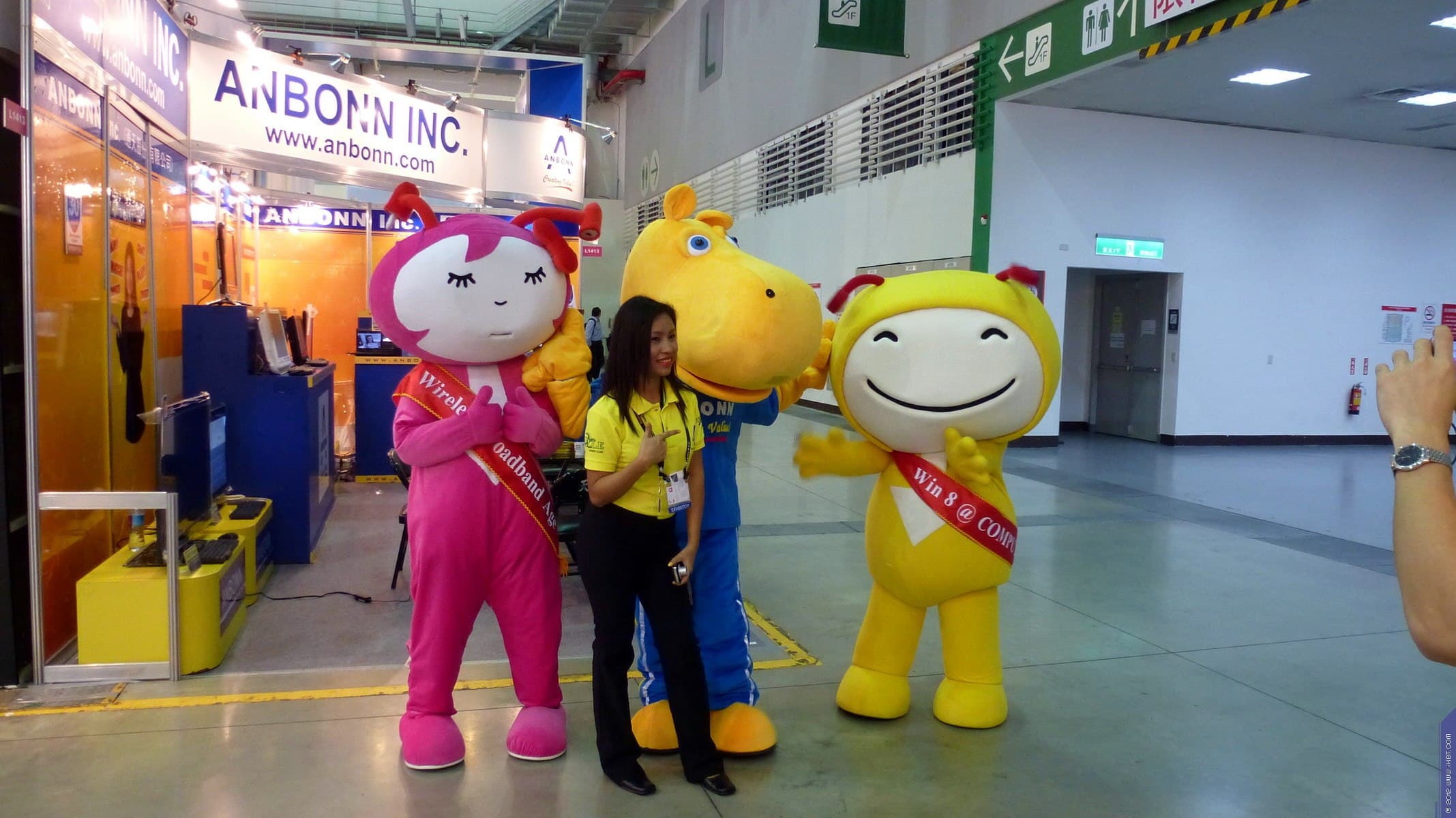 Вот пример странного пиара. Эти образы я помню чуть ли не с 2006-2007 годов, каждый год по выставке ходит сладкая парочка существ с печальным и веселым лицом (надеюсь, что между выставками они в таком виде не живут :-)). Печальный олицетворяет собой устройство с подключением с проводной сети (в качестве хвоста у него болтается штепсель), а веселый олицетворяет собой беспроводное устройство.
