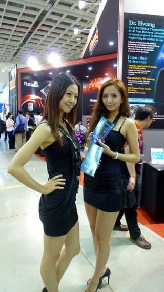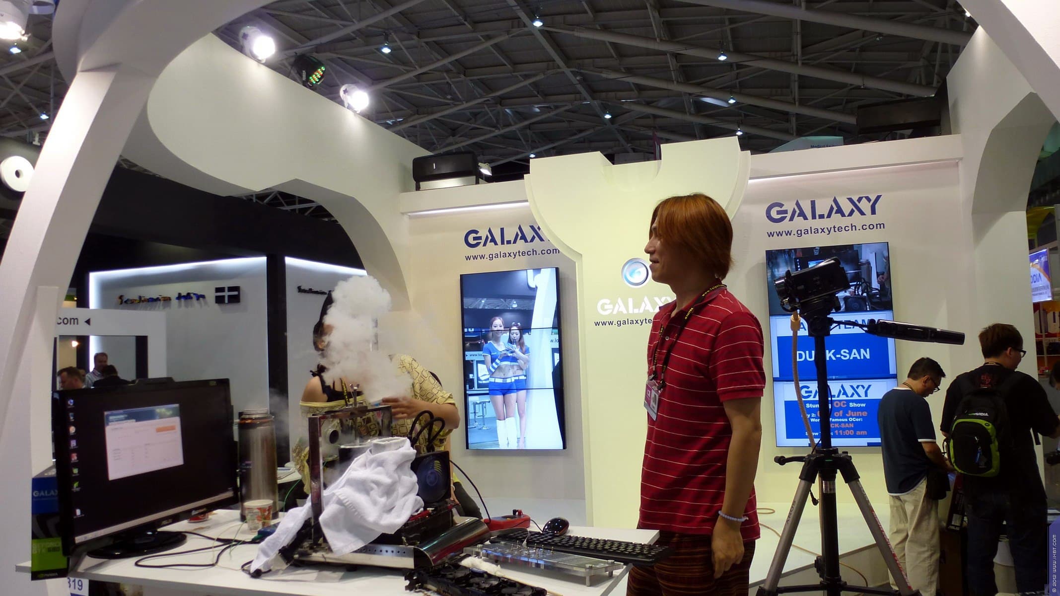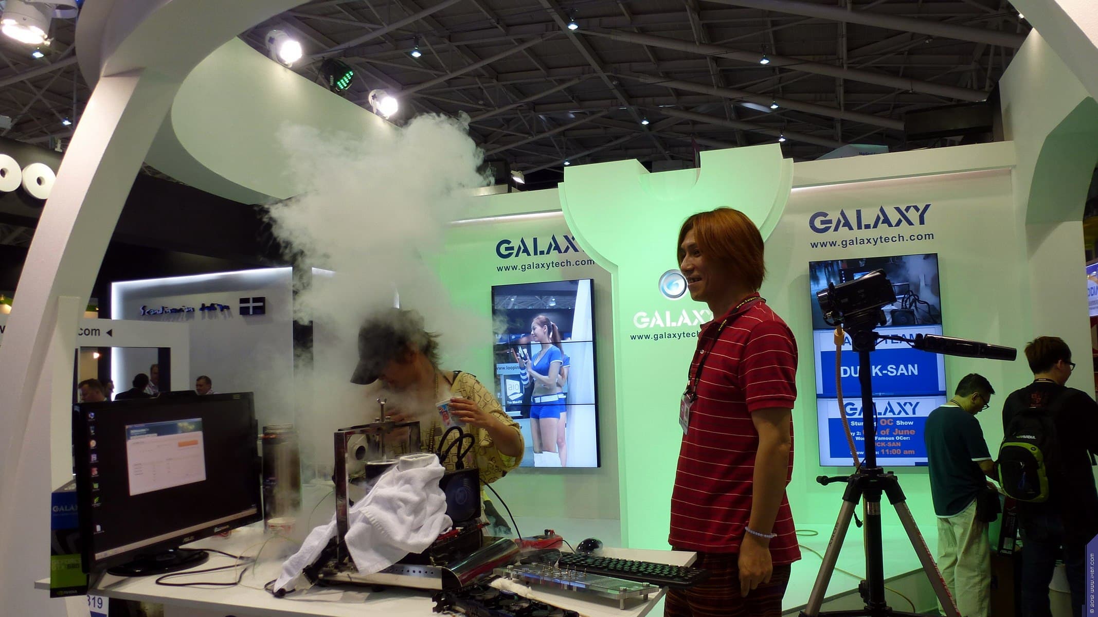На стенде Galaxy крутые оверклокеры упражнялись в разгоне с помощью жидкого азота. Девушка, играющая роль сурового прожженого геймера-разгонщика, не жалела своего рта и лица, беря в рот жидкий азот и выпуская целые столбы азотного пара, поражая некоторых проходящих мимо стенда. Ну, тоже, своего рода, пиар.
