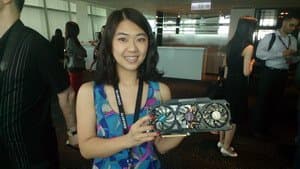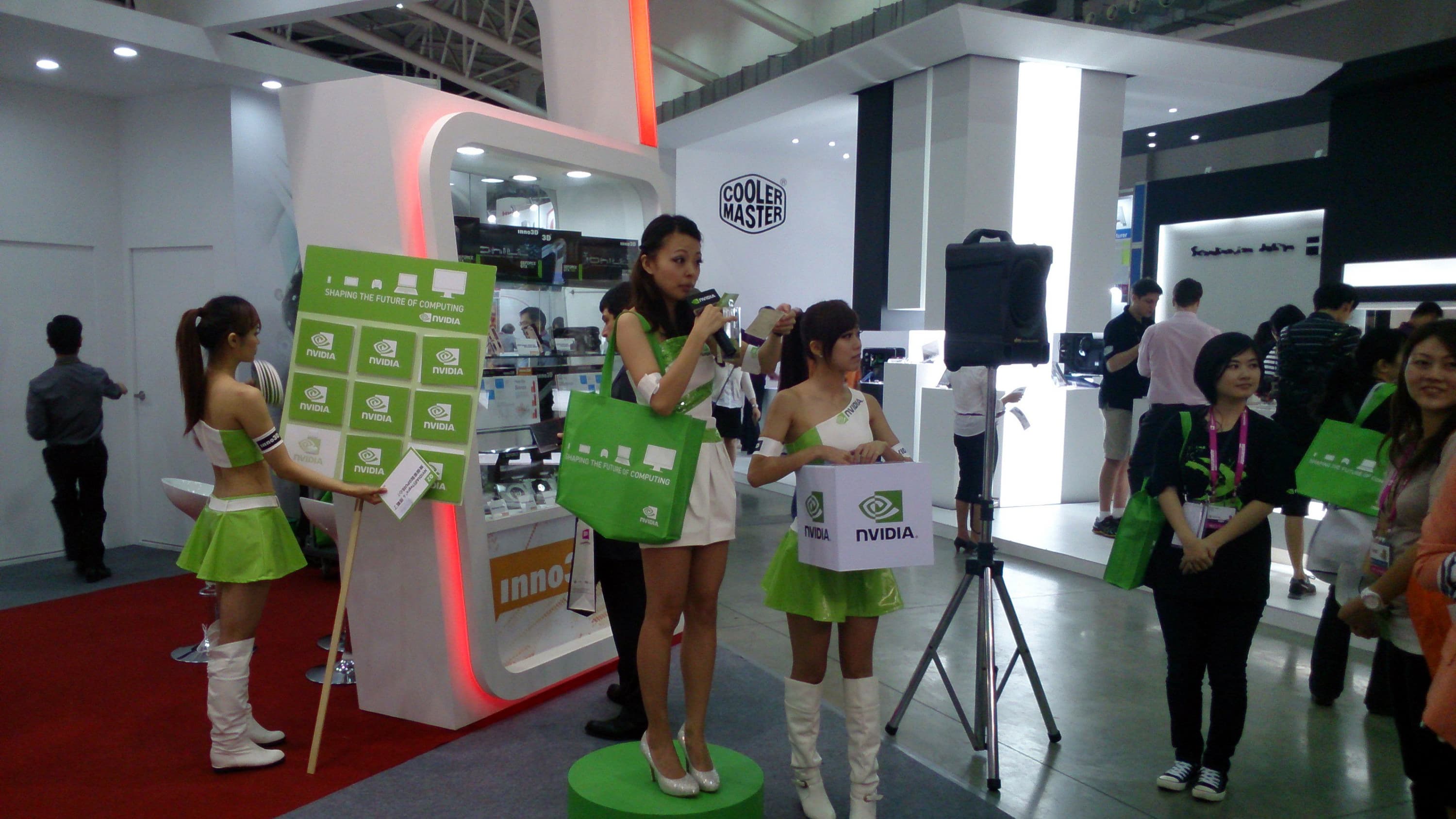 Знакомство началось с девочек из NVIDIA, стоящих с коробкой и просящих подаяние на стенде. Правда, если посмотреть на сапоги и туфли просящих, то как-то не укладывается в голове, что они бедствуют. Разумеется, это шутка, а реально была очередная акция NVIDIA по разыграшам призов, в коробку кидали визитки и заполняли какие-то анкеты.