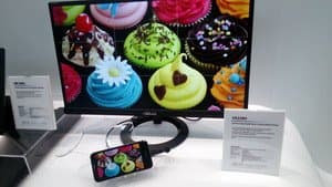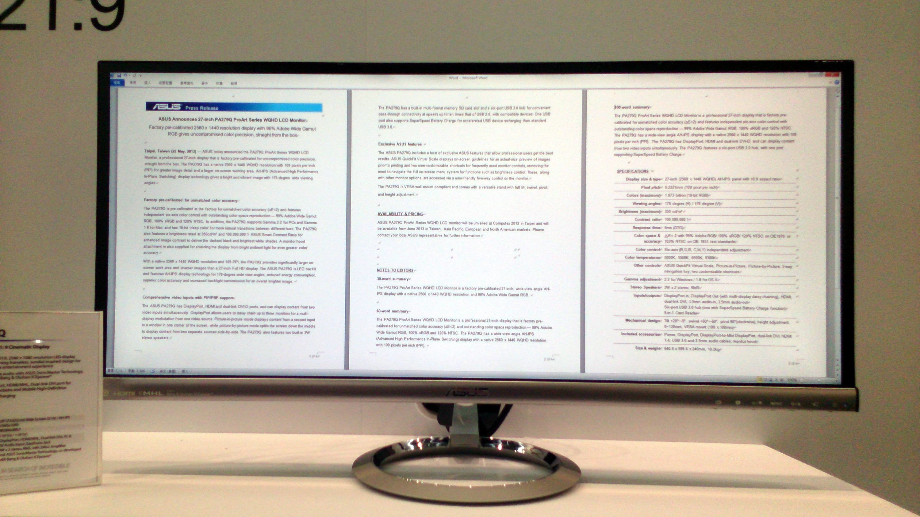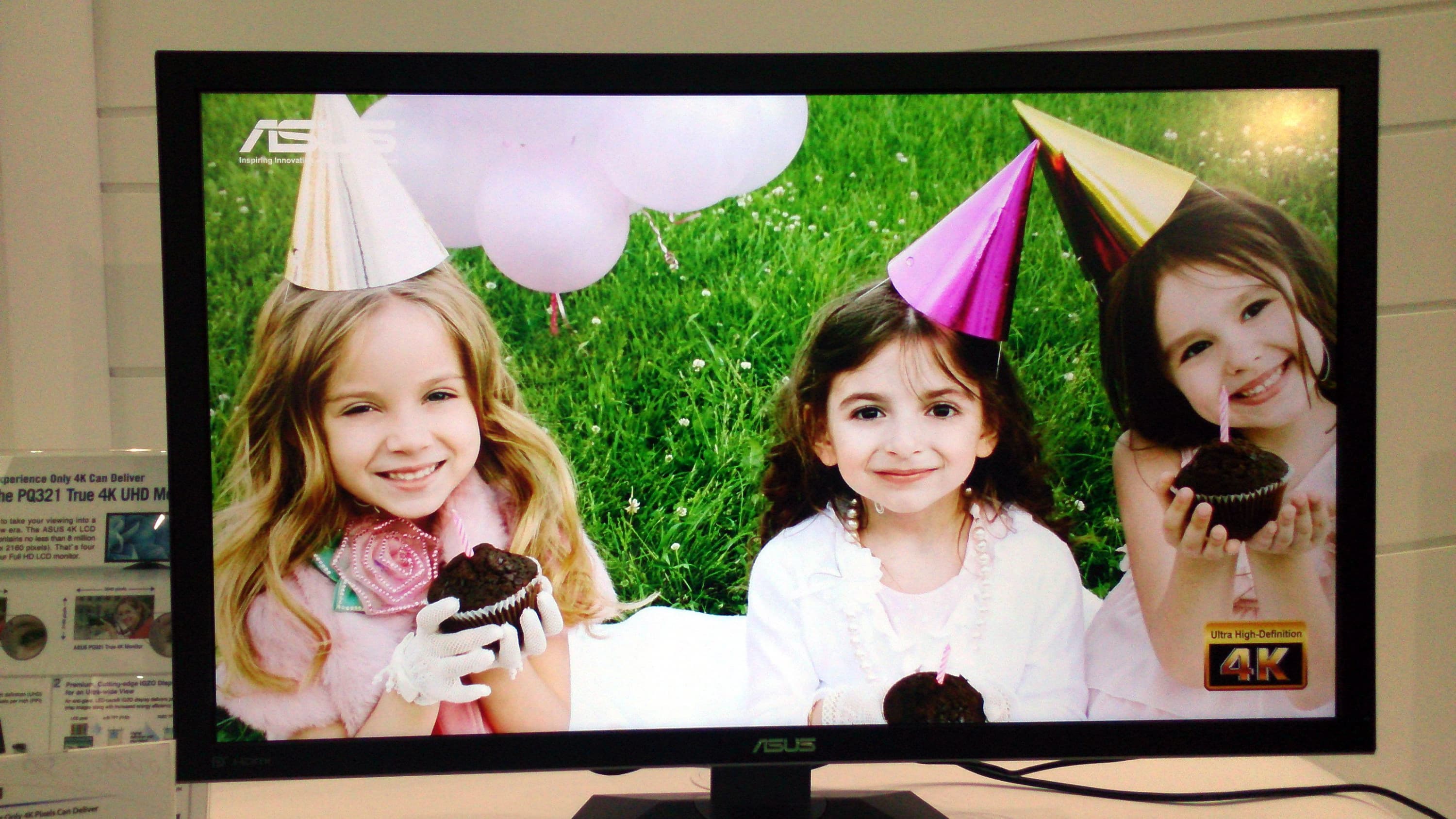 …мы попадаем в царство мониторов. Главным элементом этого сегмента экспозиции является 31-дюймовый 4К-монитор, демонстрирующий нам разрешение 3840×2160 пикселей. Разрешение является умопомрачительным для такого размера экрана на 30-дюймовых мониторах максимальное разрешение 2560×1600, а тут диагональ выросла всего на 2,54 см, а разрешение — в 1,5 раза!), так что качество картинки — это что-то из области сверхчудесного…