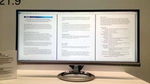 Тут же рядом монитор уже иного рода: 29-дюймовый монитор с очень большой горизонталью: соотношение сторон 21:9, разрешение 2560 на 1080. То есть по сути Full HD-монитор, раздвинутый по горизонтали. Очень хорош для текстовой работы, для многооконных задач. В общем, для тех покупателей, которые по той или иной причине не могут установить 2 или 3 монитора на столе, а хочется разместить на рабочем столе больше материалов.