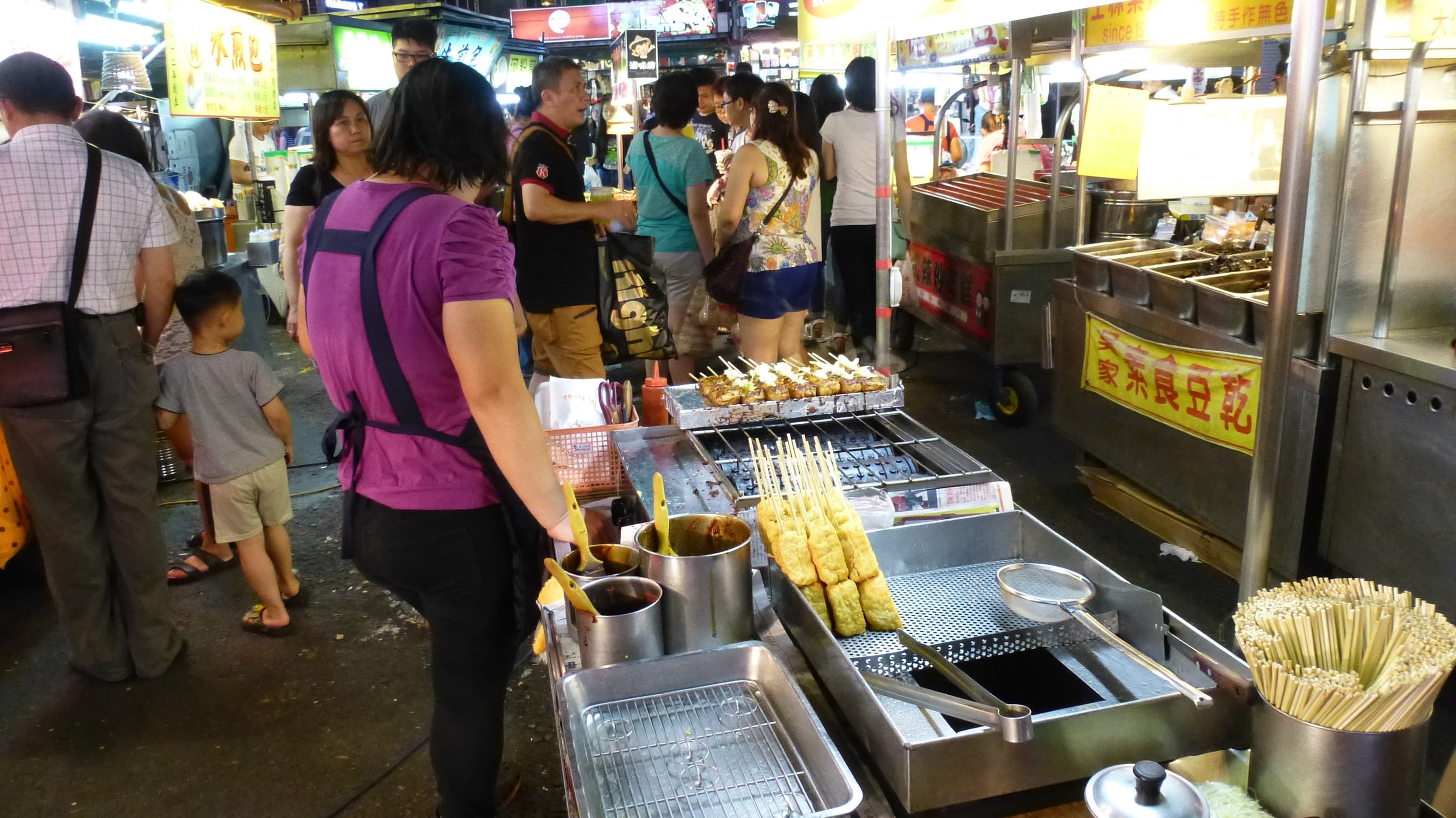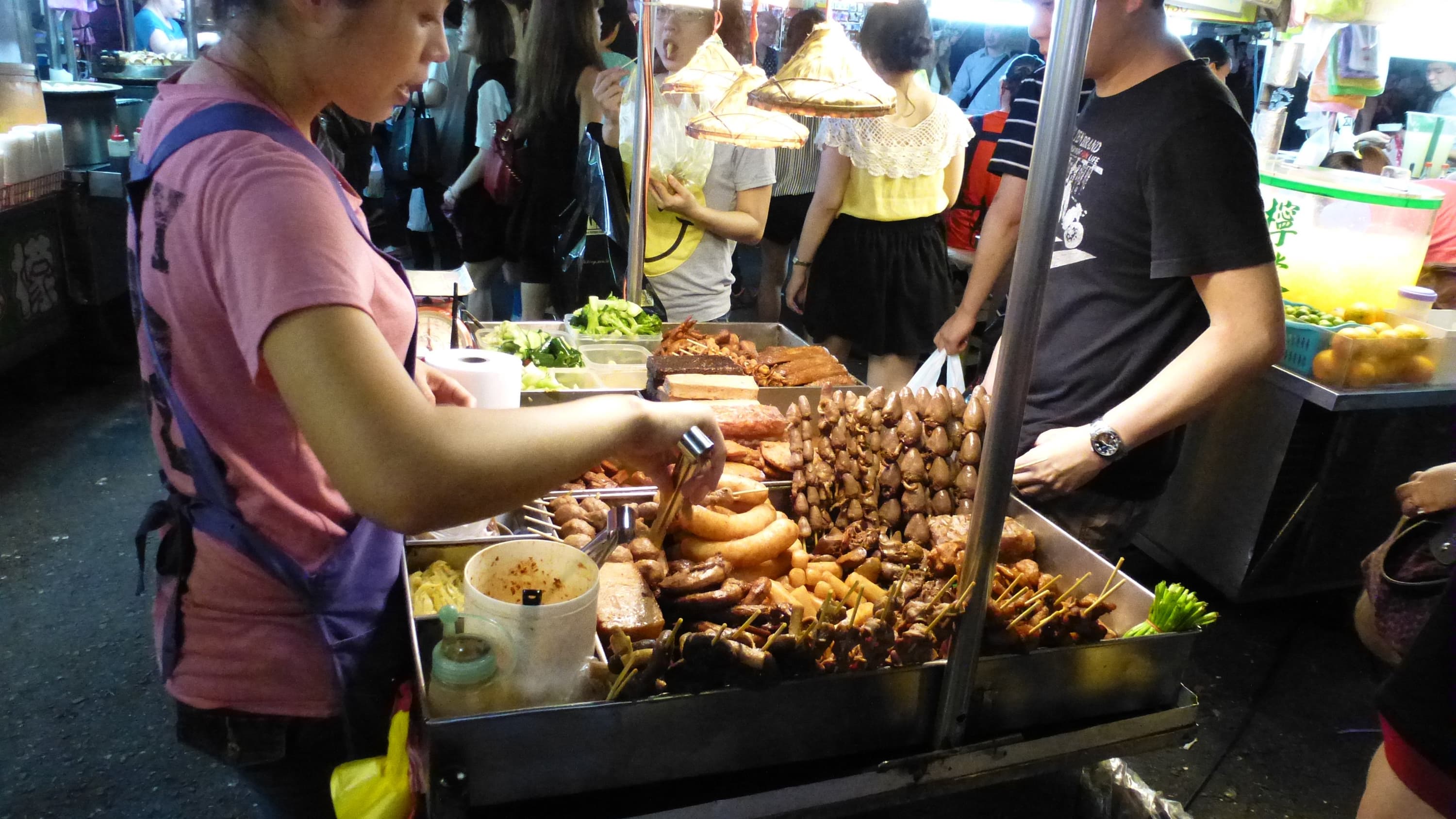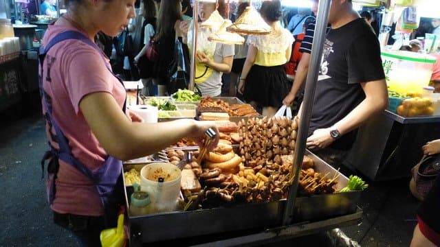 Для местных посещение ночного рынка — это прежде всего возможность поужинать. Огромное количество передвижных ларьков, где готовят и продают еду самого разного вида. Если пройти по рынку подальше, то можно почувствовать острый и резко-неприятный запах тофу (соевый творог). Когда-то, в первый приезд на Тайвань, я думал, что это нечто протухшее. Конечно же, пробовал. Вкус — очень приятный, напоминает вареное яйцо, но вот запах... Без зажатия носа невыносимо. Мой коллега, с которым мы ходили по рынку, тут же сбежал, как только почуял запах тофу :)